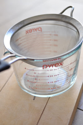 Once juiced, strain the juice over a bowl to make sure you remove seeds and pulp left behind. You can skip this step if you do not care about the seeds/pulp being there ;) My 10 lemons gave me about 1 1/3 cups of pure juice. Set to the side and keep the strainer (rinsed) in place...you will need it again.