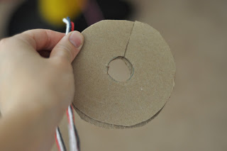 3) Get a piece of card board and cut out 2 circles...using a CD for a stencil works great. Cut a smaller hole in the middle of both of those, a long with 1 slit going through one side of your newly formed "doughnut"