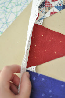 3) Iron your triangles, and sandwich them in any order into your lace trim (if you folded it)...attach them to the trim with a line of glue. I used hot glue because I wanted instant adhesion without any wait.