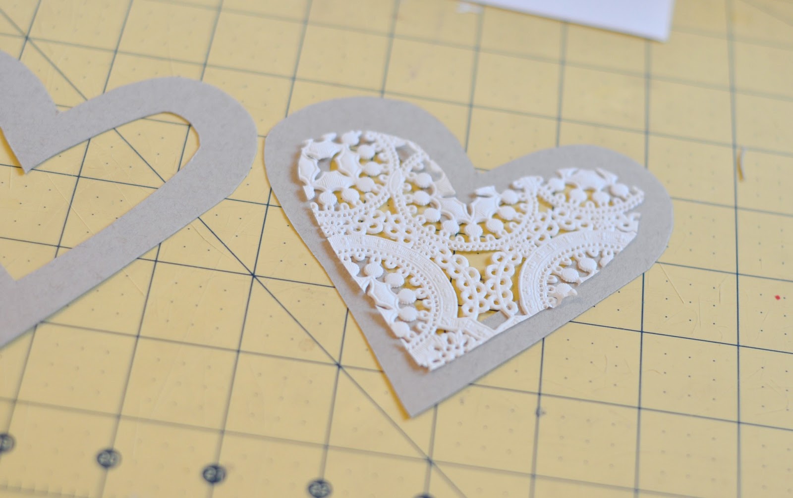 4. Take the hearts that were cut out and use one as a template on top of your doily. Using scissors, gently cut around the heart, leaving a small border of excess doily around the edge.