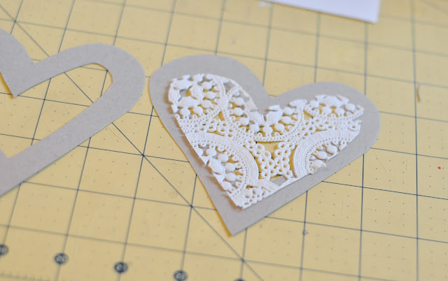 1. Cut hearts of any random sizes and variations you like out of your decorative papers. These hearts will go in between the doily-windowed hearts as accents.